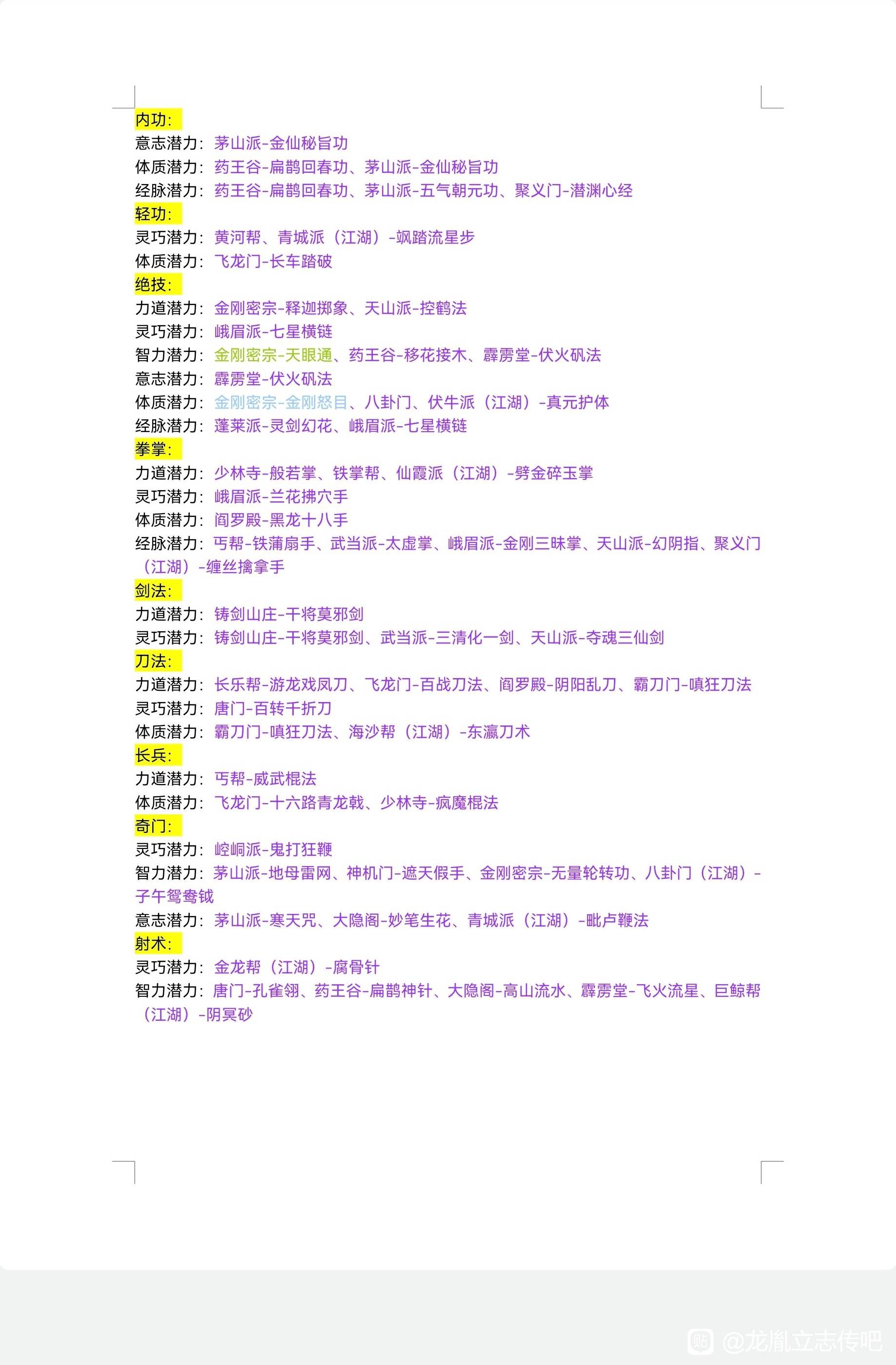 正文摘要:《龍胤立志傳》六維潛力快速閱讀精華 🚀 核心目標:快速提升角色六維基礎屬性(臂力、身法、根骨、悟性、定力、福緣)💪 主要手段: 學習特定潛力功法(內功/外功/輕功)門派建設與建築加成事件與奇遇獲取 🔑 本攻略價值:完整收錄所有能提升六維潛力的功法,讓你一週目就能規劃最優屬性路線 本文章目錄.article-toc { border: 1px solid #ddd; padding: 15px; background: #f9f9f9; border-radius: 6px; margin: 20px 0; width: 95%;}.toc-title { /* --- 以下是合併進來的 H2 樣式 --- */ font-size: 1.25em; /* 125% */ border-left: 5px solid #2A98DA; border-radius: 2px; padding: 5px 0px 5px 10px; font-weight: bold; margin: 0 0 15px 0; /* 調整了 margin,只留下方 15px */ color: #333; line-height: 1.5; background-color: #f8f8f8; /* --- 樣式合併結束 --- */}.toc-list { list-style: none; padding-left: 0;}.toc-list li { margin: 8px 0;}.toc-list a { color: #2A98DA; text-decoration: none;}.toc-list a:hover { text-decoration: underline;}.back-to-top { display: block; margin-top: 10px; font-size: 0.9em; color: #666;} 六維潛力功法完整列表document.currentScript.previousElementSibling.href = location.href.split('#')[0] + '#six_dimension'; 各功法取得方式心得分享document.currentScript.previousElementSibling.href = location.href.split('#')[0] + '#acquisition'; 屬性培養與搭配建議document.currentScript.previousElementSibling.href = location.href.split('#')[0] + '#build_strategy'; 常見問題Q&Adocument.currentScript.previousElementSibling.href = location.href.split('#')[0] + '#faq'; 《龍胤立志傳》六維潛力功法完整列表 我們實測整理後發現,遊戲中提升六維潛力的功法主要分為三大類型:內功心法、外功招式以及輕功身法。以下為各屬性對應的潛力功法總表,建議搭配《龍胤立志傳》武學培養思路攻略進行完整規劃。 本攻略建議優先鎖定以下高CP值功法,詳細培養邏輯可參考《龍胤立志傳》高性價比加潛力武功推薦: 一、門派內功傳授 首先加入對應門派(少林、武當、峨眉等)提升門派貢獻度與師父好感達成條件後即可習得該門派專屬潛力功法特別注意:部分功法需要特定前置武功等級 二、江湖奇遇與事件 大地圖隨機觸發的奇遇事件特定NPC好感達標後的傳授隱藏地點探索(如古墓、山洞等)部分功法僅能在特定時節觸發 三、武功學習與合成 若想深入瞭解武功學習機制,建議閱讀《龍胤立志傳》武功學習推薦 Ver.1.0 攻略,其中詳細說明瞭低級武功如何透過組合與突破獲得潛力加成。 關於開局屬性分配,《龍胤立志傳》開局加點攻略 1.0版本提供了完整的技藝潛力分配教學,能讓你一週目就走在最優路線上。 屬性培養與搭配建議 我們實測後發現,六維培養需要配合你的主修武功路線。新手一週目可參考《龍胤立志傳》新手難度一週目開荒攻略中的完整規劃: 外功型角色(刀劍拳掌): 優先堆疊臂力與根骨次要補足身法提升出手速度悟性維持中等即可 內功型角色(氣功暗器): 優先堆疊悟性與定力根骨影響內力上限不可忽略福緣高有助於觸發特殊事件 平衡型培養: 六維均衡發展,適合多周目體驗建議先專精兩項主屬性,其餘靠裝備與丹藥補足潛力功法越早學習效益越高 以下廣告滑動後還有帖子內容var custom_call_MIR = function (params) {if ( params === null || params.hasAd === false ) {var divRowSide;for (let index = 0; index < ONEADs.length; index++) {if (ONEADs[index].pub.player_mode === "mobile-inread") {divRowSide = ONEADs[index].pub.slotobj;}}var ins = document.createElement('ins');ins.className = 'clickforceads';ins.setAttribute('style', 'display:inline-block;');ins.setAttribute('data-ad-zone', '18264');divRowSide.appendChild(ins);var js = document.createElement('script');js.async = true;js.type = 'text/javascript';js.setAttribute('src', '//cdn.holmesmind.com/js/init.js');js.onload = function(){console.log('[ONEAD MIR] ClickForce Loaded');};divRowSide.appendChild(js);}};var _ONEAD = {};_ONEAD.pub = {};_ONEAD.pub.slotobj = document.getElementById("oneadMIRDFPTag");_ONEAD.pub.slots = ["div-onead-ad"];_ONEAD.pub.uid = "1000509";_ONEAD.pub.external_url = "https://onead.onevision.com.tw/";_ONEAD.pub.scopes = ["spotbuy", "speed"];_ONEAD.pub.player_mode_div = "div-onead-ad";_ONEAD.pub.player_mode = "mobile-inread";_ONEAD.pub.queryAdCallback = custom_call_MIR;var ONEAD_pubs = ONEAD_pubs || [];ONEAD_pubs.push(_ONEAD);var truvidScript = document.createElement('script'); truvidScript.async = true; truvidScript.setAttribute('data-cfasync','false'); truvidScript.type = 'text/javascript'; truvidScript.src = '//stg.truvidplayer.com/index.php?sub_user_id=597&widget_id=3309&playlist_id=2381&m=a&cb=' + (Math.random() * 10000000000000000); var currentScript = document.currentScript || document.scripts[document.scripts.length - 1]; currentScript.parentNode.insertBefore(truvidScript, currentScript.nextSibling); 《龍胤立志傳》六維潛力常見問題Q&A Q:潛力功法的加成是永久的嗎? 潛力功法一旦學會,提供的屬性加成即為永久生效。即使後來更換主修武功,潛力加成依然保留,因此建議盡早收集。 Q:同一屬性的多個潛力功法效果會疊加嗎? 會疊加。例如同時學會「蠻牛勁」(臂力+3)與「金剛不壞功」(臂力+5),總計可獲得臂力+8的潛力加成。 Q:潛力有上限嗎?最高能到多少? 單一屬性潛力理論無上限,但受限於遊戲中可取得的功法數量。實際一週目透過正常流程,單屬性約可堆疊至30-40點潛力。 Q:悟性會影響學習潛力功法的速度嗎? 悟性主要影響武功經驗獲取與突破機率,不直接影響潛力功法的學習條件。但高悟性角色升級快,間接更快達成學習門檻。 Q:福緣潛力實際有什