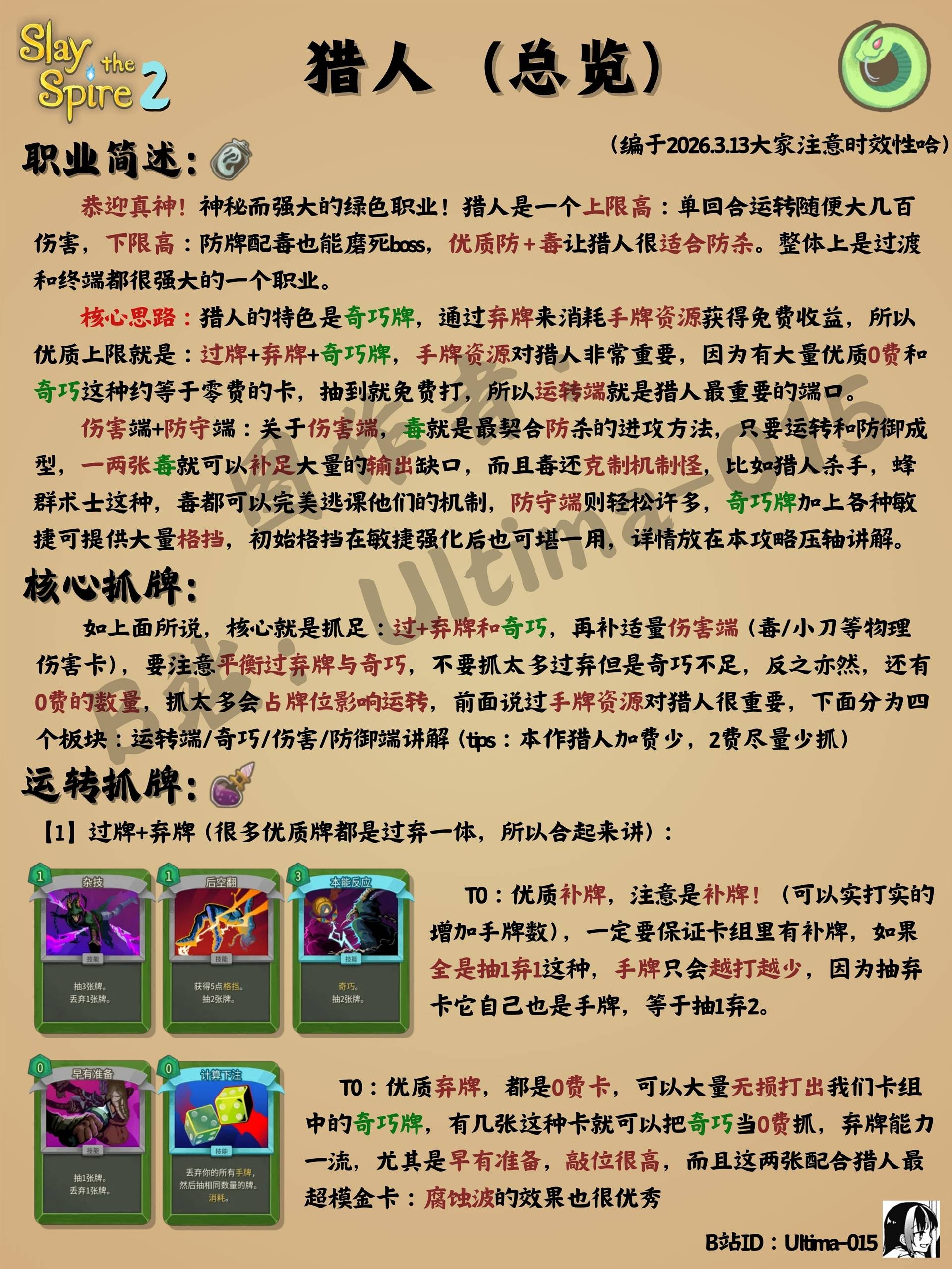 正文摘要:《殺戮尖塔2》獵人全體系卡組攻略 快速閱讀精華 🚀 快速上手:獵人初始即解鎖,掌握「奇巧」新機制是關鍵——棄牌時自動打出,徹底改變一代操作邏輯💀 三大核心流派: 棄牌流:壓縮牌庫至8-9張,追求無限循環毒流:經典疊毒機制,配合新卡強化持續傷害小刀流:大量生成小刀,爆發輸出清場⚠️ 重要改動:塔2暫無四層終幕,啟動需求與數值壓力大幅下降,運營策略更彈性🔧 SL機制變化:洗牌抽牌僅與牌庫大小相關,無法透過出牌順序操控,傳統SL技巧失效 獵人核心機制整理:奇巧與棄牌的革命 我們實測後發現,《殺戮尖塔2》的獵人雖然保留了經典的毒與小刀元素,但真正的靈魂在於全新關鍵詞「奇巧」——這是一個徹底改變操作邏輯的機制。當你棄牌時,帶有奇巧標籤的卡牌會自動打出,意味著你可以透過「主動棄牌」來觸發額外行動,而不需要消耗能量。 這個設計讓棄牌流從一代的「無奈之舉」變成了核心戰術。我們建議新手優先理解這個機制:棄牌不再是資源浪費,而是資源轉換的關鍵環節。 《殺戮尖塔2》獵人重點回顧 「奇巧」是獵人二代的核心機制,棄牌從負面行為轉為資源轉換關鍵棄牌流上限最高但成型最賭,毒流最穩定,小刀流需處理循環問題四層終幕暫缺讓整體難度曲線更平滑,SL機制改變則強化了當下決策的重要性 |