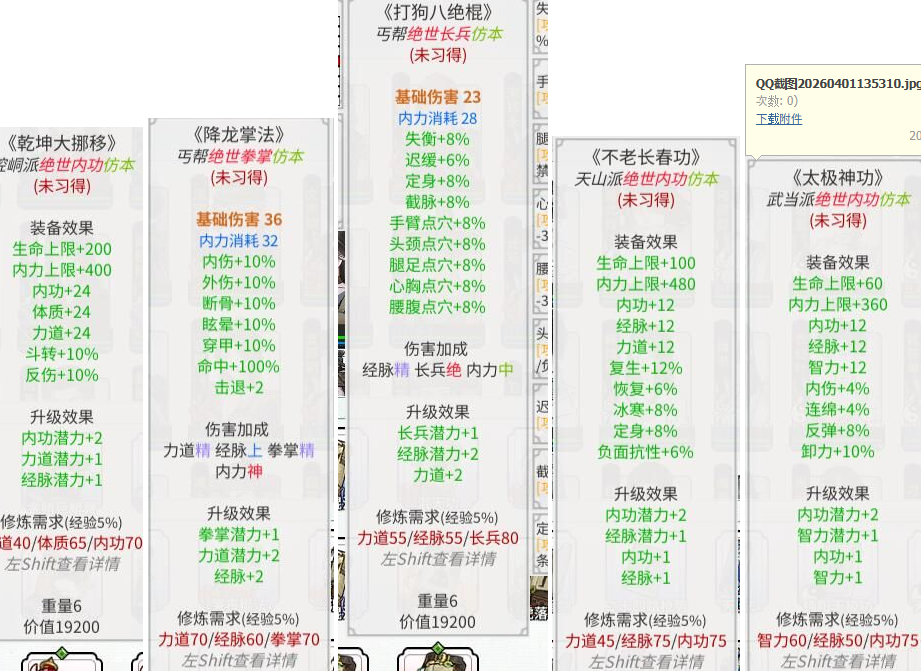 正文摘要:replyreload += ',' + 2446592; 《龍胤立志傳》乾坤大挪移功法MOD 快速閱讀精華 🌀 核心新增:崆峒派新增內功《乾坤大挪移》,靈感來自金庸武學,與斗轉星移機制相近🐉 降龍大強化:傷害與範圍大幅提升,目前版本最高單體傷害(36),必定命中設計🐾 打狗小強化:新增定身、截脈、各部位點穴詞條🌿 不老長春功強化:新增定身、冰寒詞條☯️ 武當微調:道德真經與太極神功反彈從4%提升至8%,太極神功額外增加10%卸力📦 第3版本更新重點: 加入修煉效果詞條,強化功法差異化與代入感裝備屬性與生命、內力改為3倍;特殊詞條改為2倍招式數值改為2倍文件2版本:綠色輕功給予的屬性改為智力(避免全員靈巧過高) 本文章目錄.article-toc { border: 1px solid #ddd; padding: 15px; background: #f9f9f9; border-radius: 6px; margin: 20px 0; width: 95%;}.toc-title { /* --- 以下是合併進來的 H2 樣式 --- */ font-size: 1.25em; /* 125% */ border-left: 5px solid #2A98DA; border-radius: 2px; padding: 5px 0px 5px 10px; font-weight: bold; margin: 0 0 15px 0; /* 調整了 margin,只留下方 15px */ color: #333; line-height: 1.5; background-color: #f8f8f8; /* --- 樣式合併結束 --- */}.toc-list { list-style: none; padding-left: 0;}.toc-list li { margin: 8px 0;}.toc-list a { color: #2A98DA; text-decoration: none;}.toc-list a:hover { text-decoration: underline;}.back-to-top { display: block; margin-top: 10px; font-size: 0.9em; color: #666;}乾坤大挪移與強化功法介紹document.currentScript.previousElementSibling.href = location.href.split('#')[0] + '#intro'; - 各門派強化細節document.currentScript.previousElementSibling.href = location.href.split('#')[0] + '#kungfu_detail'; 第3版本修煉效果設計說明document.currentScript.previousElementSibling.href = location.href.split('#')[0] + '#v3update'; 功法MOD下載點 🔽document.currentScript.previousElementSibling.href = location.href.split('#')[0] + '#download'; 常見問題Q&Adocument.currentScript.previousElementSibling.href = location.href.split('#')[0] + '#faq'; 乾坤大挪移與各門派強化功法介紹 這款MOD的起點是一個玩家的困惑:斗轉星移在遊戲裡的定位相當尷尬,最高斗轉比例只有70%,而且裝備欄位完全沒有對應的斗轉詞條。既然這個問題暫時無解,不如從金庸武學借來一個功能相似的功法——乾坤大挪移就這樣誕生了。 乾坤大挪移被放置在崆峒派中,由於斗轉詞條本身已經相當強力,設計上刻意控制了詞條數量,不讓它過於強勢。這款MOD同時對幾個其他武學做了強化調整,底下一一說明。 如果你打算自行調整這份 CSV 的數值,可以先去看看《龍胤立志傳》自定義武功MOD CSV設定與多配置檔教學,了解欄位結構後再動手會快很多。想搭配使用內置修改器的玩家,也可以參考《龍胤立志傳》內置MOD修改器6.6版本 DLL免安裝教學。 👉 GM後台版 遊戲 推薦 ⬇️⬇️⬇️ 快速玩各種二次元動漫手遊app 各門派強化細節 降龍十八掌——大強化 這次強化的力道是最猛的,降龍十八掌完全對得起「天下第一掌法」的稱號: 傷害提升至36:目前版本遊戲內最高單體傷害數值攻擊範圍擴大原有詞條強化新增外傷、穿甲詞條命中率設定為百分百:降龍怎麼可能miss?這個設計完全符合原著精神 打狗棒法——小強化 打狗棒法擅長點穴的特性在這次更新中被強調出來: 新增定身詞條新增截脈詞條新增各個部位點穴詞條 不老長春功——小強化 因為「八荒六合唯我獨尊功」的意象,這次給不老長春功加了幾個能讓對手動彈不得的效果: 新增定身詞條新增冰寒詞條 武當系(道德真經、太極神功)——微調 武當本家體系已相當完整,這次只做最小幅度的調整: 功法調整前調整後道德真經4% 反彈8% 反彈太極神功4% 反彈8% 反彈 + 10% 卸力 武當隨便通關的強度保留,只是讓這兩個內功更有存在感一點。 第3版本修煉效果設計說明 第3版本的核心改動是加入了修煉效果詞條,讓不同類型的功法在修煉層級上各有差異,避免後期全變成數值怪、失去代入感。底下是各功法類型的修煉效果設計邏輯: 內功修煉效果 0~5級均有生命值與內力加成屬性加成方向:內力、經脈、意志即使不裝備也保有特殊詞條效果,數值約為裝備時的1/3(裝備屬性已提升至2倍基準) 輕功修煉效果 修煉加成方向:特殊詞條、輕功、靈巧、智力設計概念:輕功練得好的人靈巧更高,才打得中輕功差的對手,這樣有點合理 絕技修煉效果 修煉加成方向:絕技、力道、體質、特殊詞條 招式修煉效果 0~2級:加成屬性與特殊效果3~5級:額外加成招式威力 整體數值倍率調整 項目調整倍率功法裝備屬性、生命、內力3倍特殊詞條2倍招式數值2倍 天賦加成的數值相對較低,如果覺得不夠用,建議搭配《龍胤立志傳》修仙天賦MOD MelonLoader安裝與CSV設定教學自行強化天賦數值。 文件2版本(綠色輕功智力版):這個版本把綠色輕功提供的靈巧屬性改成了智力。因為全員靈巧普遍過高的狀況下,雖然可以多修幾本輕功來堆靈巧,但感覺不合理——主要靠躲而不是打架的人,靈巧不該直接爆表。 《龍胤立志傳》乾坤大挪移功法MOD 下載點 底下提供三個版本,依你的需求選擇: 版本特色適合對象版本1(原始強化版)乾坤大挪移新增+各門派強化想要基本強化體驗的玩家版本2(綠色輕功智力版)在版本1基礎上,綠色輕功給智力而非靈巧覺得全員靈巧過高、想保持平衡的玩家版本3(第3版完整版)加入修煉效果詞條、全面數值倍率調整想要完整差異化體驗、避免後期全變數值怪的玩家 所有站內附件皆會