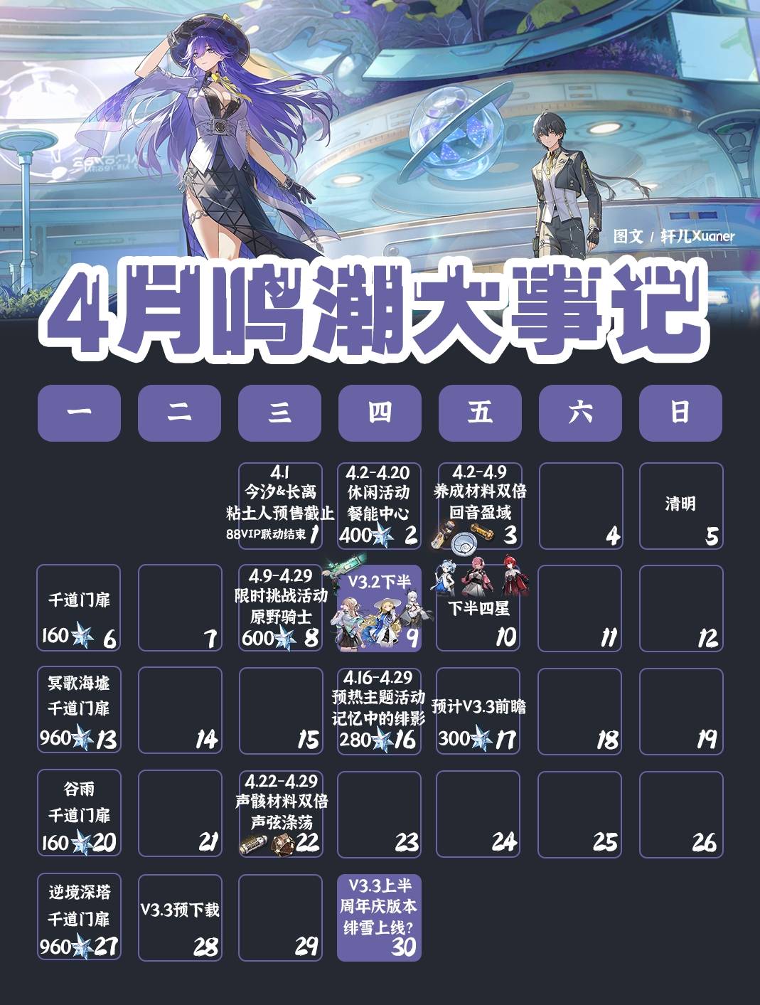 正文摘要:《鳴潮》2026年4月活動日曆 快速閱讀精華 🚀 4月9日 V3.2下半更新:琳奈、贊妮、菲比復刻卡池開啟,琳奈為3.x版本強力副C,搭配莫寧可大幅提升主C輸出💪 4月30日 V3.3週年慶版本:全新五星角色緋雪(冷凝迅刀)上半登場,達妮婭(熱熔音感儀)預計5月21日下半上線🔑 Xbox平臺預告:預計今年7月《鳴潮》將正式登陸Xbox主機💡 準備建議:想抽取新角色的漂泊者請提前儲備星聲與培養材料 V3.2下半卡池更新:琳奈復刻值得抽嗎? 4月9日《鳴潮》迎來V3.2下半版本更新,本次復刻三位人氣角色:琳奈、贊妮與菲比。我們實測後發現,琳奈在3.x版本中定位為關鍵副C,其技能機制能與莫寧形成絕佳搭配,對各類主C角色的輸出提升效果非常顯著。 若你正在規劃隊伍配置,建議優先考慮琳奈的抽取。相關培養材料與聲骸搭配可參考我們整理的《鳴潮》3.0上半活動一覽攻略,提前準備才能第一時間拉滿戰力。 《鳴潮》2026年4月活動日曆_常見問題Q&A 以下廣告滑動後還有帖子內容var custom_call_MIR = function (params) {if ( params === null || params.hasAd === false ) {var divRowSide;for (let index = 0; index < ONEADs.length; index++) {if (ONEADs[index].pub.player_mode === "mobile-inread") {divRowSide = ONEADs[index].pub.slotobj;}}var ins = document.createElement('ins');ins.className = 'clickforceads';ins.setAttribute('style', 'display:inline-block;');ins.setAttribute('data-ad-zone', '18264');divRowSide.appendChild(ins);var js = document.createElement('script');js.async = true;js.type = 'text/javascript';js.setAttribute('src', '//cdn.holmesmind.com/js/init.js');js.onload = function(){console.log('[ONEAD MIR] ClickForce Loaded');};divRowSide.appendChild(js);}};var _ONEAD = {};_ONEAD.pub = {};_ONEAD.pub.slotobj = document.getElementById("oneadMIRDFPTag");_ONEAD.pub.slots = ["div-onead-ad"];_ONEAD.pub.uid = "1000509";_ONEAD.pub.external_url = "https://onead.onevision.com.tw/";_ONEAD.pub.scopes = ["spotbuy", "speed"];_ONEAD.pub.player_mode_div = "div-onead-ad";_ONEAD.pub.player_mode = "mobile-inread";_ONEAD.pub.queryAdCallback = custom_call_MIR;var ONEAD_pubs = ONEAD_pubs || [];ONEAD_pubs.push(_ONEAD);var truvidScript = document.createElement('script'); truvidScript.async = true; truvidScript.setAttribute('data-cfasync','false'); truvidScript.type = 'text/javascript'; truvidScript.src = '//stg.truvidplayer.com/index.php?sub_user_id=597&widget_id=3309&playlist_id=2381&m=a&cb=' + (Math.random() * 10000000000000000); var currentScript = document.currentScript || document.scripts[document.scripts.length - 1]; currentScript.parentNode.insertBefore(truvidScript, currentScript.nextSibling); Q:琳奈真的值得抽嗎?我已經有其他副C了。 琳奈在3.x版本中的副C地位非常穩固,尤其搭配莫寧時能為主C提供顯著增傷。若你追求版本強度或想完善冰隊體系,建議優先入手。 Q:週年慶版本通常有哪些福利? 根據往年經驗,週年慶期間通常會有限定簽到獎勵、免費抽卡資源、自選復刻池等活動。具體內容請以4月30日官方公告為準。 Q:緋雪和達妮婭哪個比較強?該怎麼選? 緋雪為冷凝屬性迅刀角色,達妮婭為熱熔屬性音感儀角色。兩者定位與屬性不同,建議根據你目前的隊伍缺口與屬性需求來選擇,或參考後續實測評測。 Q:Xbox版會跟PC、手機版互通進度嗎? 目前官方尚未公佈詳細的跨平臺機制,但依照業界慣例,Xbox版本很可能支援與PC、手機的帳號進度互通。確切資訊請持續關注官方消息。 Q:我現在該存星聲還是抽V3.2下半? 若你已經有穩定隊伍且對琳奈沒有特別需求,建議保留資源等待4月30日的週年慶版本。新角色緋雪與達妮婭通常會帶來更貼近版本環境的機制設計。 《鳴潮》2026年4月活動重點回顧 4月9日 V3.2下半:琳奈、贊妮、菲比復刻,琳奈為3.x版本核心副C4月30日 V3.3週年慶:緋雪(上半)、達妮婭(5/21下半)全新登場7月預告:《鳴潮》Xbox平臺正式上線,主機玩家即將加入 |
