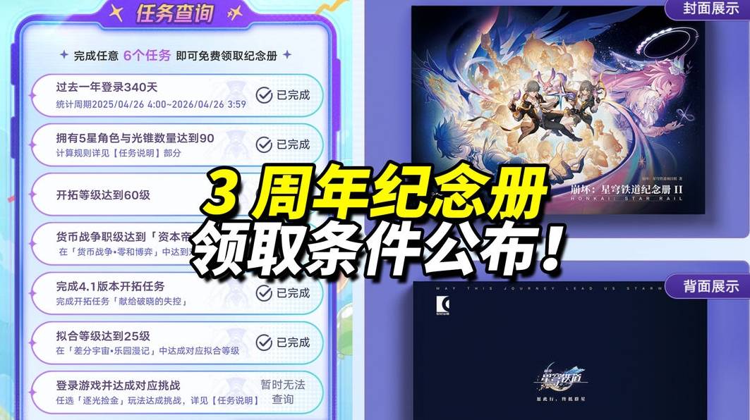 正文摘要:《崩壞:星穹鐵道》3週年紀念冊 快速閱讀精華 🚀 240萬份實體紀念冊免費送:220萬份達成條件直接領取,15萬份抽獎、5萬份好友互助💪 7大任務達成6項即可:登入天數、五星角色數、開拓等級、差分宇宙等條件彈性達標🔑 關鍵時間點:4月22日開放填寫地址,4月26日3:59截止統計,越早填寫越早拿到⚠️ 登入天數不足補救:每日凌晨4點重置,統計至4月26日3:59,每日可累積1天 《崩壞:星穹鐵道》3週年紀念冊領取資格全整理 本次《崩壞:星穹鐵道》三週年慶可說是誠意滿滿,官方準備了鋼彈240萬份的實體紀念冊免費贈送給開拓者!我們實測整理後發現,這次活動設計相當友善——7個任務條件中只要達成任意6項就能直接領取,讓不同類型的玩家都有機會拿到這份珍貴的週年實體周邊。 👉 GM後台版 遊戲 推薦 ⬇️⬇️⬇️ 快速玩各種二次元動漫手遊app 根據我們的資料分析,220萬份採用「達標即領」制,另有15萬份進入抽獎池、5萬份開放好友互助。建議各位開拓者優先確認自己是否能在第一階段達標領取,畢竟抽獎與互助的競爭較為激烈。 7大任務條件心得分享與達成技巧 以下為完整的任務條件說明,我們針對每項提供實用的達成建議: 任務一:登入天數要求 遊戲以凌晨4點作為新一天的更新時間點,統計區間為開服至4月26日3:59。若你閱讀本文時還未達標,可以參考日曆推算剩餘可累積天數——假設今天是4月11日且尚未登入,後續每天上線還能再累積15天。 任務二:五星角色與光錐數量 重要排除項目:開拓者(主角)本身、黑塔商店兌換的光錐、滿星魂後溢出的金數皆不計入。 計入項目:常駐池角色、旅伴金靈或光錐碎憶兌換、部分活動贈送的五星角色/光錐都算數。 由於4.2版本於4月22日更新,紀念冊活動覆蓋上半卡池部分時間,包含「銀狼LV.999、大麗花、遐蝶、流螢」等卡池。若你差少量五星數量達標,可評估是否抽卡補足,或使用旅伴金靈兌換角色(本次新增藿藿、知更鳥)。 任務三:開拓等級達70級 目前遊戲內最高開拓等級為70級,達成條件相對單純。若等級不足的開拓者,建議利用剩餘時間補完劇情——崩鐵已新增劇情跳過與核心概括功能,推進速度比過往快上許多。 任務四:A7資本帝王職級 此條件可用「雙鞋阿格萊雅3晝神」陣容輕鬆達成。職級尚不足的開拓者,這段時間集中補一下進度,難度不算太高。 任務五:完成4.1版本開拓任務 條件最簡單的一項——只需完成4.1版本開拓任務「獻給破曉的失控」。根據「流光憶庭」玩家的實測記錄,此段劇情若不跳過、完整聽完語音,耗時約5-6小時。 任務六:差分宇宙·樂園漫記等級 需達成最新版「差分宇宙·樂園漫記」的指定等級,透過完成穩態陣列內的條件獲取星瓊與擬合經驗值。我們建議這段時間優先投入此模式,本身就有3000+星瓊可領,是相當值得耕耘的板塊。 任務七:三大深淵關卡通關 包含以下三項,達成門檻相當親民: 末日幻影第3關(已更新)虛構敘事其三(已更新)混沌回憶第9關(2天後更新新關卡) 關鍵時間軸與地址填寫注意事項 4月22日:開放填寫收貨地址,強烈建議第一批完成填寫4月26日3:59:所有任務統計截止5月10日23:59:地址填寫最終截止(逾期無法獲得) 我們特別提醒:本次紀念冊發放僅限中國大陸地區,港澳臺地區暫不支援配送。由於玩家數量龐大,每晚1小時填寫可能導致發貨延後半個月,務必把握第一時間! 登入天數計算與補救攻略 許多開拓者最擔心的就是「登入天數不足」的問題。我們整理出三個關鍵時間區間供查詢: 一週年回顧:開服~2024年3月31日(查早期登入天數)二週年年度報告(米遊社):2024年4月1日~2025年3月31日(查中期登入天數)三週年紀念冊統計:統計至2025年4月26日3:59 若發現天數差距較大,可優先確認其他6項任務是否有5項已達標或容易達成,彈性調整策略。 相關攻略推薦 若你想進一步掌握《崩壞:星穹鐵道》的最新版本資訊,我們推薦參考以下攻略: 《崩壞:星穹鐵道》4.1版本星瓊統計 完整攻略——零課與月卡玩家必看抽數計算《崩壞:星穹鐵道》4.1版本前瞻攻略——兌換碼領取與新內容總整理 以下廣告滑動後還有帖子內容var custom_call_MIR = function (params) {if ( params === null || params.hasAd === false ) {var divRowSide;for (let index = 0; index < ONEADs.length; index++) {if (ONEADs[index].pub.player_mode === "mobile-inread") {divRowSide = ONEADs[index].pub.slotobj;}}var ins = document.createElement('ins');ins.className = 'clickforceads';ins.setAttribute('style', 'display:inline-block;');ins.setAttribute('data-ad-zone', '18264');divRowSide.appendChild(ins);var js = document.createElement('script');js.async = true;js.type = 'text/javascript';js.setAttribute('src', '//cdn.holmesmind.com/js/init.js');js.onload = function(){console.log('[ONEAD MIR] ClickForce Loaded');};divRowSide.appendChild(js);}};var _ONEAD = {};_ONEAD.pub = {};_ONEAD.pub.slotobj = document.getElementById("oneadMIRDFPTag");_ONEAD.pub.slots = ["div-onead-ad"];_ONEAD.pub.uid = "1000509";_ONEAD.pub.external_url = "https://onead.onevision.com.tw/";_ONEAD.pub.scopes = ["spotbuy", "speed"];_ONEAD.pub.player_mode_div = "div-onead-ad";_ONEAD.pub.player_mode = "mobile-inread";_ONEAD.pub.queryAdCallback = custom_call_MIR;var ONEAD_pubs = ONEAD_pubs || [];ONEAD_pubs.push(_ONEAD);var truvidScript = document.createElement('script'); truvidScript.async = true; truvidScript.setAttribute('data-cfasync','false'); truvidScript.type = 'text/javascript'; truvidScript.src = '//stg.truvidplayer.com/index.php?sub_user_id=597&widget_id=3309&pla
