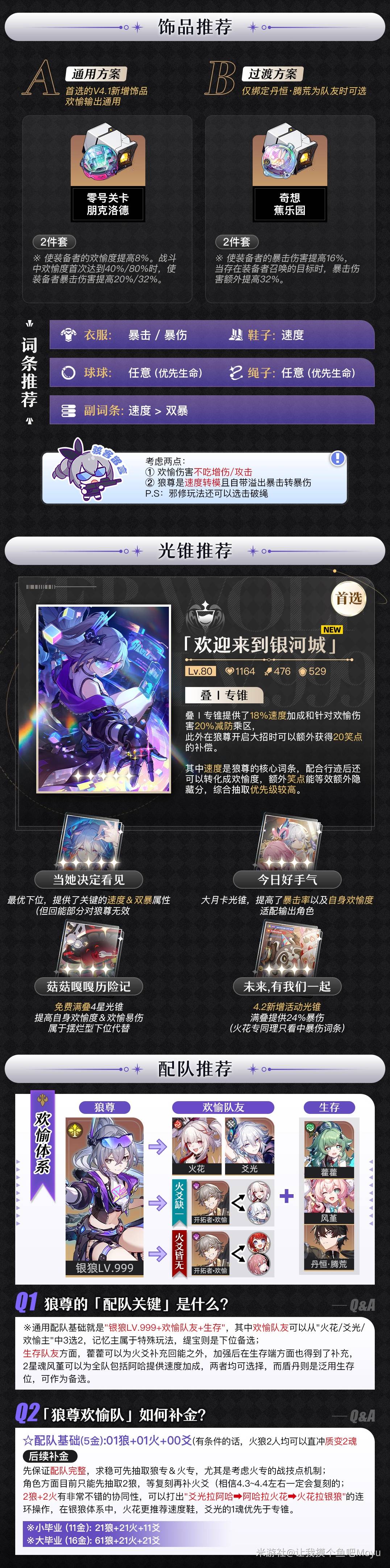 正文摘要:《崩壞:星穹鐵道》狼尊快速閱讀精華 🚀 核心定位:虛數屬性歡愉命途主C,4.2週年慶版本主推大C💪 關鍵機制:隱藏分轉暴擊暴傷,超高速多動輸出🔑 抽取建議:0命機制完整,專武提升顯著,推薦至少抽0+0⚡ 配隊核心:需搭配能頻繁觸發追加攻擊的隊友📦 素材預刷:建議提前囤穩固晶石與虛數素材 .article-toc { border: 1px solid #ddd; padding: 15px; background: #f9f9f9; border-radius: 6px; margin: 20px 0; width: 90%;}.article-toc br { display: none;}.toc-title { /* --- 以下是合併進來的 H2 樣式 --- */ font-size: 1.25em; /* 125% */ border-left: 5px solid #2A98DA; border-radius: 2px; padding: 5px 0px 5px 10px; font-weight: bold; margin: 0 0 15px 0; /* 調整了 margin,只留下方 15px */ color: #333; line-height: 1.5; background-color: #f8f8f8; /* --- 樣式合併結束 --- */}.toc-list { list-style: none; padding-left: 0;}.toc-list li { margin: 8px 0;}.toc-list a { color: #2A98DA; text-decoration: none;}.toc-list a:hover { text-decoration: underline;}.back-to-top { display: block; margin-top: 10px; font-size: 0.9em; color: #666;}本文章目錄 狼尊是誰?4.2版本虛數歡愉主C定位document.currentScript.previousElementSibling.href = location.href.split('#')[0] + '#intro'; 核心技能機制整理document.currentScript.previousElementSibling.href = location.href.split('#')[0] + '#mechanic'; 光錐推薦與替代選擇document.currentScript.previousElementSibling.href = location.href.split('#')[0] + '#lightcone'; 遺器套裝與詞條搭配document.currentScript.previousElementSibling.href = location.href.split('#')[0] + '#relic'; 配隊推薦與隊友選擇document.currentScript.previousElementSibling.href = location.href.split('#')[0] + '#team'; 突破與行跡素材整理document.currentScript.previousElementSibling.href = location.href.split('#')[0] + '#material'; 抽取建議:狼尊值不值得抽?document.currentScript.previousElementSibling.href = location.href.split('#')[0] + '#pull'; 常見問題Q&Adocument.currentScript.previousElementSibling.href = location.href.split('#')[0] + '#faq'; 狼尊是誰?4.2版本虛數歡愉主C定位 狼尊,正式名稱為「銀狼LV.999」,是《崩壞:星穹鐵道》4.2版本「如是,眾生歡笑不已」推出的五星虛數屬性歡愉命途角色。這位來自龐克洛德的天才駭客以「升至999級的無敵玩家」姿態回歸,徹底捨棄了舊有的量子屬性與虛無命途,轉型為純粹的輸出核心。 我們實測後發現,狼尊的設計圍繞著「隱藏分」機制運作——透過戰鬥中的特定行為累積隱藏分數,再將其轉化為暴擊率與暴擊傷害加成。這種成長型輸出模式讓狼尊在長線作戰中越戰越勇,特別適合需要多回合輸出的高難度內容。 👉 GM後台版 遊戲 推薦 ⬇️⬇️⬇️ 快速玩各種二次元動漫手遊app 核心技能機制整理 戰技:駭客入侵的極致 狼尊的戰技不僅能造成虛數傷害,更是觸發「隱藏分」累積的主要手段。每次施放戰技時,會根據目標身上存在的負面效果數量額外獲得隱藏分。這意味著隊伍的負面效果覆蓋率直接影響狼尊的輸出上限。 終結技:無敵玩家的登場 終結技是狼尊爆發輸出的關鍵。施放時會立即結算當前累積的隱藏分,轉化為大量的暴擊率與暴擊傷害加成,並對敵方全體造成高額虛數傷害。我們建議在隱藏分接近上限時再施放終結技,以最大化傷害收益。 天賦與追加攻擊 狼尊的天賦賦予其在隊友觸發追加攻擊時進行協戰的能力。這項機制讓狼尊與歡愉體系的隊友產生極佳的化學反應,形成「追加攻擊連鎖」的輸出循環。 光錐推薦與替代選擇 首選:專屬光錐「無敵玩家:999級」 這把光錐完美契合狼尊的機制,提供高額暴擊傷害加成與隱藏分獲取效率提升。特效還能在狼施放終結技後額外行動一次,大幅強化爆發節奏。我們強烈推薦有能力抽取專武的玩家至少取得0+1配置。 替代選擇 「於夜色中」:提供速度與暴擊傷害加成,適合高速狼尊構築「無可取代的東西」:攻擊力加成與擊殺回能,泛用性較高「星海巡遊」:黑塔商店可兌換,新手友好選擇 遺器套裝與詞條搭配 外圈四件套 首推:「識海迷墜的學者」4件套 這套遺器能提升暴擊率並在施放終結技後獲得傷害加成,與狼尊的爆發週期完美契合。我們實測後發現,這套遺器能讓狼尊的終結技傷害提升約15-20%。 內圈二件套 首推:「格拉默鐵騎的銀河帝國」或「蒼穹戰線格拉默」 這兩套內圈遺器分別提供速度與暴擊傷害加成,可根據隊伍配置與詞條質量選擇。若狼尊速度能達到160以上,格拉默鐵騎的收益會更為顯著。 主詞條優先級 軀幹:暴擊率 / 暴擊傷害(根據傷害防禦平衡選擇)腳部:速度(優先)或攻擊力%位面球:虛數屬性傷害加成連結繩:攻擊力% 副詞條優先級 速度 > 暴擊率 = 暴擊傷害 > 攻擊力% > 其他 配隊推薦與隊友選擇 狼尊的配隊核心在於「追加攻擊頻率」與「負面效果覆蓋」。我們推薦以下幾種配隊方向: 純歡愉體系隊 狼尊(主C)花火:提供戰技點回復與暴擊傷害加成,追加攻擊觸發狼尊協戰緹寶:追加攻擊核心,與狼尊形成雙C輸出生存位(靈砂/藿藿):提供治療與增益 混搭隊伍 若沒有完整歡愉體系,也可搭配其他能頻繁觸發追加攻擊的角色,如緋英或託帕。想了解更多角色配隊細節,可參考我們的《崩壞:星穹鐵道》緹寶養成攻略與《崩壞:星穹鐵道》緋英養成攻略。 突破與行跡素材整理 角色突破素材 穩固晶石(虛數屬性通用)狼尊專屬素材:「無敵玩家的勳章」信用點 行跡升級素材 歡愉命途素材「無窮假身的遺恨」系列素材信用點 我們建議在4.2版本開放前提前囤積穩