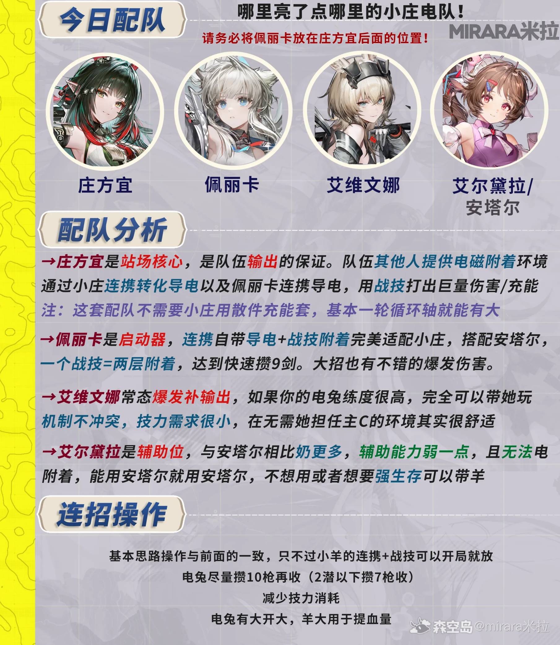 正文摘要:《明日方舟:終末地》莊方宜核心重點 快速閱讀精華 🚀 角色定位:雷屬性站場主C,擅長持續輸出與爆發銜接 核心機制圍繞「雷鳴」狀態疊加與技能循環展開💪 推薦隊伍框架: 雙雷共鳴:莊方宜 + 雷屬性副C/輔助元素反應隊:搭配水或火屬性觸發超載/蒸發🔑 手法關鍵: 技能釋放順序影響「雷鳴」層數累積終結技時機決定爆發傷害上限 目錄指引 .article-toc { border: 1px solid #ddd; padding: 15px; background: #f9f9f9; border-radius: 6px; margin: 20px 0; width: 90%;}.article-toc br { display: none;}.toc-title { /* --- 以下是合併進來的 H2 樣式 --- */ font-size: 1.25em; /* 125% */ border-left: 5px solid #2A98DA; border-radius: 2px; padding: 5px 0px 5px 10px; font-weight: bold; margin: 0 0 15px 0; /* 調整了 margin,只留下方 15px */ color: #333; line-height: 1.5; background-color: #f8f8f8; /* --- 樣式合併結束 --- */}.toc-list { list-style: none; padding-left: 0;}.toc-list li { margin: 8px 0;}.toc-list a { color: #2A98DA; text-decoration: none;}.toc-list a:hover { text-decoration: underline;}.back-to-top { display: block; margin-top: 10px; font-size: 0.9em; color: #666;}本文章目錄 快速閱讀精華document.currentScript.previousElementSibling.href = location.href.split('#')[0] + '#quick_read'; - 角色機制深度整理document.currentScript.previousElementSibling.href = location.href.split('#')[0] + '#character_analysis'; - 配隊思路與隊友選擇document.currentScript.previousElementSibling.href = location.href.split('#')[0] + '#team_building'; - 輸出手法與排軸教學document.currentScript.previousElementSibling.href = location.href.split('#')[0] + '#rotation_guide'; - 裝備與養成建議document.currentScript.previousElementSibling.href = location.href.split('#')[0] + '#equipment'; 常見問題Q&Adocument.currentScript.previousElementSibling.href = location.href.split('#')[0] + '#faq'; 角色機制深度整理:為什麼莊方宜是雷隊核心? 我們實測後發現,莊方宜的戰鬥設計圍繞「雷鳴」機制構建——這是理解她輸出邏輯的關鍵。當技能命中敵人時,會累積雷鳴層數,層數越高,終結技與特定技能的傷害倍率就越可觀。 👉 GM後台版 遊戲 推薦 ⬇️⬇️⬇️ 快速玩各種二次元動漫手遊app 與其他雷屬性角色相比,莊方宜的優勢在於站場持續性。她的普通攻擊連段流暢,且中段攻擊帶有小幅位移,這讓她在實戰中更容易調整站位、規避傷害。我們建議新手先熟悉她的攻擊節奏,再銜接技能釋放。 若你正在規劃開荒隊伍,可以參考我們整理的《明日方舟:終末地》開荒隊伍搭配新手攻略,瞭解不同屬性隊伍的建構邏輯。 配隊思路與隊友選擇 雙雷共鳴隊:最大化雷屬性收益 這是本攻略建議的優先方向。雙雷配置能啟動「雷鳴共鳴」效果,提升全隊雷傷並加快能量回復。隊友選擇上,我們推薦: 雷屬性輔助/副C:提供後臺掛雷或增傷支援通用輔助:聚怪或護盾角色,提升輸出環境穩定性治療/生存位:高難內容必備,確保莊方宜能完整打完循環 對於冰隊或物理隊有興趣的玩家,也可參考《明日方舟:終末地》開荒物理碎冰隊攻略或低配冰隊三測攻略,比較不同屬性的操作手感。 元素反應隊:超載與蒸發的傷害潛力 若你手邊缺乏優質雷屬性隊友,可考慮讓莊方宜擔任「雷觸發器」: 水屬性隊友:觸發超載反應,造成範圍雷傷並削韌火屬性隊友:蒸發反應雖非雷屬性主導,但能補足對單傷害 這種配置對裝備要求較高,需要確保莊方宜的元素精通或對應增傷屬性達標。 輸出手法與排軸教學 基礎循環:三階段輸出法 我們將莊方宜的輸出拆解為以下階段,建議在訓練場反覆練習: 啟動階段(0-3秒):普攻起手 → 技能E(雷鳴標記) 目的:快速疊加首層雷鳴,啟動傷害加成蓄能階段(3-8秒):持續普攻穿插技能E → 技能Q(雷鳴強化) 關鍵:觀察雷鳴層數UI,在3-4層時釋放Q技能收益最高爆發階段(8-12秒):終結技釋放 → 後續追擊 終結技會根據當前雷鳴層數提升倍率,滿層與低層差距可達40%以上 進階排軸:隊友技能銜接 雙雷隊的精髓在於「錯開爆發期」。我們建議: 隊友1的增益技能覆蓋莊方宜的蓄能階段隊友2的後臺傷害在莊方宜終結技後觸發,延續輸出空窗期治療技能預留在終結技前後,確保高傷害動作不被打斷 想深入瞭解戰鬥系統的操作細節,可參考《明日方舟終末地》戰鬥系統攻略。 裝備與養成建議 主屬性優先級 武器:暴擊率/暴擊傷害 > 攻擊力% > 元素傷害%聖遺物主詞條: 時之沙:攻擊力%空之杯:雷元素傷害%理之冠:暴擊率或暴擊傷害(依武器平衡)副詞條:雙暴 > 攻擊力% > 元素精通(反應隊)/ 能量回復(循環優先) 技能升級順序 我們建議:終結技 > 技能Q > 技能E > 普通攻擊 終結技的等級直接影響爆發上限,是資源投入的首要目標。 莊方宜配隊與手法_常見問題Q&A 以下廣告滑動後還有帖子內容var custom_call_MIR = function (params) {if ( params === null || params.hasAd === false ) {var divRowSide;for (let index = 0; index < ONEADs.length; index++) {if (ONEADs[index].pub.player_mode === "mobile-inread") {divRowSide = ONEADs[index].pub.slotobj;}}var ins = document.createElement('ins');ins.className = 'clickforceads';ins.setAttribute('style', 'display:inline-block;');ins.setAttribute('data-ad-zone', '18264');divRowSide.appendChild(ins);var js = document.createElement('script');js.async = true;js.type = 'text/javascript';js.setAttribute('src', '//cdn.holmesmind.com/js/init.js');js.onload = function(){console.log('[ONEAD MIR] ClickForce Loaded');};divRowSide.appendChild(js);}};var _ONEAD = {};_ONEAD.pub = {};_ONEAD.pub.slotobj = document.getElementById("oneadMIRDFPTag");_ONEAD.pu