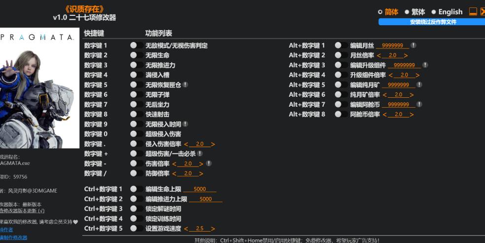 正文摘要:replyreload += ',' + 2451999; 《人機迷網》風靈月影修改器 快速閱讀 想在《人機迷網》v1.0 開無敵、刷資源,又不知道怎麼裝修改器?底下我們整理了完整的安裝步驟與所有功能說明,讓你一次搞定! 🎮 對應版本:v1.0+,後續版本預計全部或部分功能相容⚠️ 必要前置:需使用 REFramework 繞過反作弊,安裝步驟見下方教學🔑 核心功能: 無敵模式、無限生命、無限子彈、快速射擊超級傷害/一擊必殺、傷害倍率、防禦倍率資源編輯:月絲、升級組件、純月礦、阿艙幣遊戲速度設定、鎖定解謎/訓練時間 💪 快捷鍵說明:預設使用小鍵盤數字鍵;無小鍵盤可用修改器介面按鈕操作🚀 語言支援:簡體、繁體、English 三語切換,切換後自動設為預設語言 .article-toc { border: 1px solid #ddd; padding: 15px; background: #f9f9f9; border-radius: 6px; margin: 20px 0; width: 90%;}.article-toc br { display: none;}.toc-title { /* --- 以下是合併進來的 H2 樣式 --- */ font-size: 1.25em; /* 125% */ border-left: 5px solid #2A98DA; border-radius: 2px; padding: 5px 0px 5px 10px; font-weight: bold; margin: 0 0 15px 0; /* 調整了 margin,只留下方 15px */ color: #333; line-height: 1.5; background-color: #f8f8f8; /* --- 樣式合併結束 --- */}.toc-list { list-style: none; padding-left: 0;}.toc-list li { margin: 8px 0;}.toc-list a { color: #2A98DA; text-decoration: none;}.toc-list a:hover { text-decoration: underline;}.back-to-top { display: block; margin-top: 10px; font-size: 0.9em; color: #666;}本文章目錄修改器介紹與前置需求document.currentScript.previousElementSibling.href = location.href.split('#')[0] + '#intro'; REFramework 反作弊繞過安裝教學document.currentScript.previousElementSibling.href = location.href.split('#')[0] + '#install'; 基本操作說明document.currentScript.previousElementSibling.href = location.href.split('#')[0] + '#basic'; 主要功能快捷鍵document.currentScript.previousElementSibling.href = location.href.split('#')[0] + '#func_main'; Ctrl 組合功能document.currentScript.previousElementSibling.href = location.href.split('#')[0] + '#func_ctrl'; Alt 組合資源編輯document.currentScript.previousElementSibling.href = location.href.split('#')[0] + '#func_alt'; 常見問題Q&Adocument.currentScript.previousElementSibling.href = location.href.split('#')[0] + '#faq'; 修改器介紹與前置需求 這次風靈月影針對《人機迷網》推出了二十七項修改器,涵蓋戰鬥強化、資源編輯、遊戲速度控制等多種功能,是目前功能最完整的修改工具之一。 重要提醒:《人機迷網》內建反作弊機制,直接執行修改器可能無效甚至導致遊戲錯誤。本修改器需搭配 REFramework 才能正常運作,請務必先完成安裝步驟再啟動遊戲。 👉 GM後台版 遊戲 推薦 ⬇️⬇️⬇️ 快速玩各種二次元動漫手遊app REFramework 反作弊繞過安裝教學 這是最關鍵的步驟,跳過這步修改器完全無法作用,請照順序一步一步來: 開啟修改器後,點選右上角的 「安裝繞過反作弊文件」 按鈕在彈出的視窗中選擇 《人機迷網》的遊戲安裝目錄,將繞過文件儲存至該位置完成後 執行或重新啟動遊戲,讓 REFramework 在遊戲啟動時自動載入 完成這三步後,修改器就能正常偵測遊戲記憶體並啟用各項功能了。是不是很簡單? 基本操作說明 語言切換:點選修改器介面上的「簡體」「繁體」「English」可即時切換,切換後自動記憶為預設語言關閉快捷鍵偵測:按下 Ctrl+Shift+Home 可暫停快捷鍵偵測,避免與遊戲按鍵衝突;再按一次重新開啟無小鍵盤的筆電:所有功能皆可透過修改器視窗上的開關按鈕手動啟用,不一定需要實體小鍵盤 主要功能快捷鍵 以下功能均使用 小鍵盤數字鍵 觸發: 快捷鍵功能說明數字鍵 1無敵模式 / 無視傷害判定數字鍵 2無限生命數字鍵 3無限推進力數字鍵 4滿侵入槽數字鍵 5無限恢復匣倉數字鍵 6無限子彈數字鍵 7無後座力數字鍵 8快速射擊數字鍵 9無限侵入時間數字鍵 0超級侵入傷害數字鍵 .侵入傷害倍率數字鍵 +超級傷害 / 一擊必殺數字鍵 -傷害倍率數字鍵 /防禦倍率 Ctrl 組合功能 快捷鍵功能說明Ctrl + 數字鍵 1編輯生命上限Ctrl + 數字鍵 2編輯推進力上限Ctrl + 數字鍵 3鎖定解謎時間Ctrl + 數字鍵 4鎖定訓練時間Ctrl + 數字鍵 5設定遊戲速度 Alt 組合資源編輯 快捷鍵功能說明Alt + 數字鍵 1編輯月絲Alt + 數字鍵 2月絲倍率Alt + 數字鍵 3編輯升級組件Alt + 數字鍵 4升級組件倍率Alt + 數字鍵 5編輯純月礦Alt + 數字鍵 6純月礦倍率Alt + 數字鍵 7編輯阿艙幣Alt + 數字鍵 8阿艙幣倍率 《人機迷網》修改器重點回顧 先裝 REFramework:點修改器右上角「安裝繞過反作弊文件」→ 選遊戲目錄 → 重啟遊戲,缺一不可快捷鍵用小鍵盤:筆電沒小鍵盤可改用修改器介面按鈕,功能完全相同遇到問題先關防毒:大多數修改器無效問題源自防毒軟體攔截,以系統管理員身份執行可解決大半情況 PRAGMATA.v1.0.Plus.27.Trainer-FLiNG.rar 所有站內附件皆會附上安全掃描報告請會員查看純淨度百分比後判斷使用(adsbygoogle = window.adsbygoogle || []).push({});相關檔案須知:取得檔案前,請先詳細閱讀文章內容避免不必要錯誤與誤會發生。也可多參考文章討論樓層內容了解附件檔案相關討論資訊。 【此文章部分內容隱藏中】 解除隱藏說明教學點擊下方 繼續閱讀文章 後請仔細觀看文章內容 並依照指示進行下一步最後完成解除隱藏後系統會回到此文章自動顯示隱藏內容~繼續閱讀 常見問題Q&A Q:「數字鍵」是指哪個鍵?筆電沒有小鍵盤怎麼辦? A:數字鍵指的是鍵盤右側的獨立小鍵盤數字區