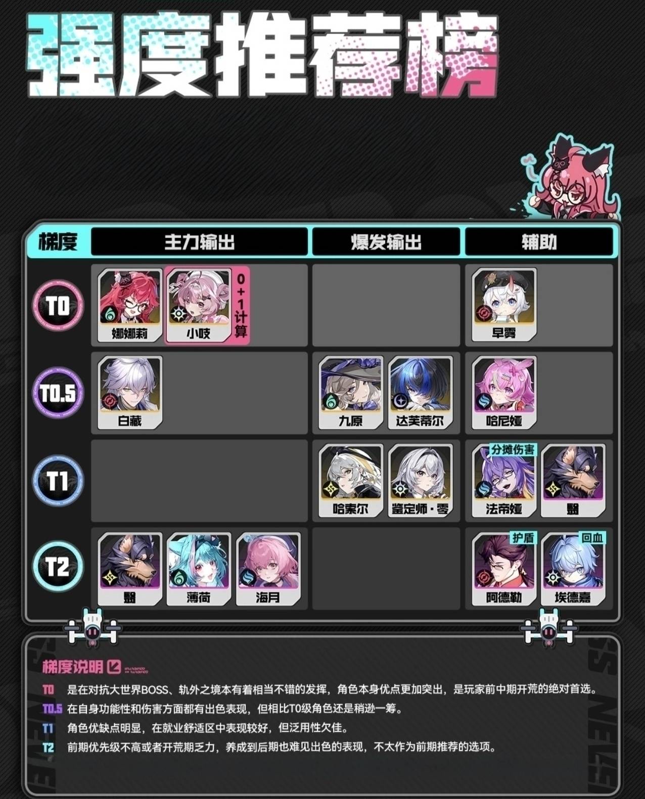正文摘要:《異環》新手角色培養推薦 快速閱讀精華 🚀 零課金首選:小吱免費滿命,50級後傷害碾壓多數S級角色,資源拉滿絕對不虧💎 限定必抽:娜娜莉開服唯一限定S,0命即強勢,爆傷全角色最高,新手友好🔑 自選S首選:早霧聚怪+增傷+控場三神合一,所有主C的最佳隊友⚡ 常駐優先:九原能聚能奶能打,1覺解鎖治療,泛用性拉滿🛡️ 生存兜底:法蒂婭全隊承傷+回血,特定場合有奇效 文章目錄 .article-toc { border: 1px solid #ddd; padding: 15px; background: #f9f9f9; border-radius: 6px; margin: 20px 0; width: 90%;}.article-toc br { display: none;}.toc-title { /* --- 以下是合併進來的 H2 樣式 --- */ font-size: 1.25em; /* 125% */ border-left: 5px solid #2A98DA; border-radius: 2px; padding: 5px 0px 5px 10px; font-weight: bold; margin: 0 0 15px 0; /* 調整了 margin,只留下方 15px */ color: #333; line-height: 1.5; background-color: #f8f8f8; /* --- 樣式合併結束 --- */}.toc-list { list-style: none; padding-left: 0;}.toc-list li { margin: 8px 0;}.toc-list a { color: #2A98DA; text-decoration: none;}.toc-list a:hover { text-decoration: underline;}.back-to-top { display: block; margin-top: 10px; font-size: 0.9em; color: #666;}本文章目錄 T0必練角色|開荒/深淵/後期全能document.currentScript.previousElementSibling.href = location.href.split('#')[0] + '#t0_must'; T0.5強力角色|次選培養document.currentScript.previousElementSibling.href = location.href.split('#')[0] + '#t0_5_strong'; T1可用角色|過渡/特定場景document.currentScript.previousElementSibling.href = location.href.split('#')[0] + '#t1_situational'; 新手開荒配隊建議document.currentScript.previousElementSibling.href = location.href.split('#')[0] + '#team_building'; 常見問題Q&Adocument.currentScript.previousElementSibling.href = location.href.split('#')[0] + '#faq'; T0必練角色|開荒/深淵/後期全能,絕對好用 我們實測後發現,以下三位角色在《異環》開服版本中表現最為全面,無論是新手開荒、深淵挑戰或後期內容都能穩定發揮,建議優先投入資源培養。 👉 GM後台版 遊戲 推薦 ⬇️⬇️⬇️ 快速玩各種二次元動漫手遊app 小吱:零課金戰神,免費滿命 透過「都市大亨」活動即可免費取得並滿命,這點對於無課玩家來說是極大優勢。小吱的核心機制為固傷搭配持續爆發輸出,我們測試發現50級後傷害能夠碾壓多數S級角色。操作上相當無腦,且適配所有隊伍配置,是本攻略最推薦資源全拉的必練角色。 娜娜莉:開服唯一限定S,單體/羣傷天花板 娜娜莉擁有全角色最高的爆傷數值,普攻為遠程閃電攻擊且無視重力限制,大招更是具備AOE範圍傷害加上幽靈協戰效果。關鍵在於0命即具備完整強度,對新手相當友好。若資源允許,本攻略建議有抽必抽、有練必練。 早霧:聚怪+增傷+控場三神合一 早霧的長按技能具備強力聚怪效果,搭配泥潭禁錮控場,1命更解鎖全隊增傷能力。我們認為她是所有主C角色的最佳隊友,也是新手池自選S的首選目標。想了解更多早霧的詳細操作與配隊,可以參考《異環》早霧角色攻略。 T0.5強力角色|次選培養,泛用性極高 這些角色在特定領域表現出色,若已經取得建議優先培養至可用水準。 九原:超大範圍聚怪,1覺解鎖治療 九原的聚怪範圍相當優秀,1覺醒後更解鎖治療能力,形成能聚怪、能補血、能輸出的完整功能。我們評估其泛用性為常駐池角色中最高,抽到的話優先級僅次於T0角色。 白藏:對羣清怪最強,殘血斬殺 白藏的AOE爆發傷害在清圖刷本時效率極高,具備殘血斬殺機制。若隊伍中缺乏主C角色,白藏是優先補上的選擇。 哈尼婭:純後臺增傷,新手強力輔助 哈尼婭作為純後臺輔助,能提供穩定增傷效果,操作簡單不佔場。完整培養攻略可參考《異環》哈尼婭培養攻略。 達芙蒂爾:破盾強,但操作門檻高 破盾能力優秀,但需要掌握特定操作手法,且破盾場景需求較為單一,適合有一定遊戲經驗的玩家使用。 T1可用角色|過渡/特定場景,不優先培養 這些角色在特定場合有發揮空間,但整體優先級較低,建議作為過渡使用。 翳:速切爆發,破盾強 翳的速切爆發與破盾能力出色,但目前版本偏輔助功能大於主C定位,適配速切隊伍。想深入瞭解翳的黑影遁地跑圖玩法,可參考《異環》翳角色全攻略。 法蒂婭:全隊承傷+分攤傷害+回血 法蒂婭提供全隊承傷與傷害分攤機制,搭配回血效果,在高難度內容中作為生存兜底有奇效,但日常推圖效率較低。 哈索爾:近戰爆發,機動性強 哈索爾具備優秀近戰爆發與機動性,但操作要求較高,需要熟練掌握走位與輸出循環。 新手開荒配隊建議 我們建議新手在組隊時遵循「主C+輔助+治療/控場」的基本架構。以小吱或娜娜莉作為核心輸出,搭配早霧或九原提供聚怪與增益,再視情況補上治療或破盾角色。 關於更完整的開荒隊伍配置,包括主C怎麼搭、治療從哪來等細節,建議參考《異環》公測開荒配隊推薦。另外,抽卡資源與角色培養材料的對照關係,也可查看《異環》抽卡與角色培養資源對照表攻略。 若還在猶豫自選S要選哪個,我們強烈建議先看完《異環》自選S級角色怎麼選的分析,開服抽完再選纔是最聰明的做法。 以下廣告滑動後還有帖子內容var custom_call_MIR = function (params) {if ( params === null || params.hasAd === false ) {var divRowSide;for (let index = 0; index < ONEADs.length; index++) {if (ONEADs[index].pub.player_mode === "mobile-inread") {divRowSide = ONEADs[index].pub.slotobj;}}var ins = document.createElement('ins');ins.className = 'clickforceads';ins.setAttribute('style', 'display:inline-block;');ins