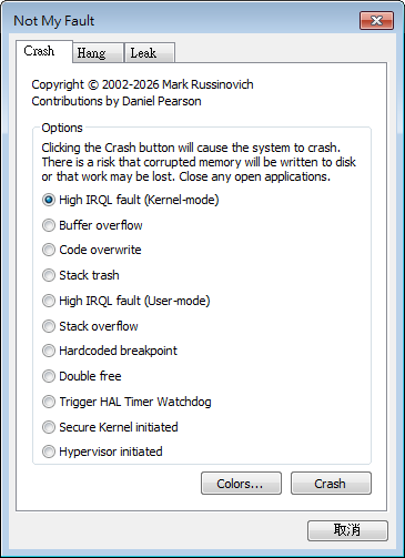 正文摘要:replyreload += ',' + 2454785;.article-toc { border: 1px solid #ddd; padding: 15px; background: #f9f9f9; border-radius: 6px; margin: 20px 0; width: 90%;}.article-toc br { display: none;}.toc-title { /* --- 以下是合併進來的 H2 樣式 --- */ font-size: 1.25em; /* 125% */ border-left: 5px solid #2A98DA; border-radius: 2px; padding: 5px 0px 5px 10px; font-weight: bold; margin: 0 0 15px 0; /* 調整了 margin,只留下方 15px */ color: #333; line-height: 1.5; background-color: #f8f8f8; /* --- 樣式合併結束 --- */}.toc-list { list-style: none; padding-left: 0;}.toc-list li { margin: 8px 0;}.toc-list a { color: #2A98DA; text-decoration: none;}.toc-list a:hover { text-decoration: underline;}.back-to-top { display: block; margin-top: 10px; font-size: 0.9em; color: #666;}本文章目錄 軟體介紹與使用教學document.currentScript.previousElementSibling.href = location.href.split('#')[0] + '#intro'; 軟體截圖展示document.currentScript.previousElementSibling.href = location.href.split('#')[0] + '#screenshot'; 附件下載 🔽document.currentScript.previousElementSibling.href = location.href.split('#')[0] + '#download'; 《NotMyFault》核心主題 快速閱讀精華 🚀 微軟官方出品: 由微軟 Sysinternals 團隊開發,專業級系統測試工具! 免安裝即可執行,隨身碟帶著走超方便。 模擬多種系統崩潰情境,學習除錯流程的最佳幫手。 🔑 核心功能亮點: 人為製造藍屏當機,產生 Crash Dump 傾印檔案。 支援高 IRQL 錯誤、緩衝區溢位、堆疊溢位等進階測試。 模擬系統掛起、記憶體洩漏等複雜異常狀態。 【語 言】:英文版 【軟體名稱】:NotMyFault 【版本資訊】:v4.40 【軟體大小】:1.41MB 【更新日期】:2024年(依官方釋出時間) 【使用權限】:免費軟體 【系統支持】:Windows 【軟體介紹】: NotMyFault 是一款由微軟 Sysinternals 團隊所開發的 Windows 測試工具,主要用途是在測試或教學環境中,人為製造系統錯誤、當機或凍結情況,以產生當機傾印檔(Crash Dump)供後續分析與除錯。它透過核心層級的驅動程式執行各種高風險操作,可模擬多種常見的系統錯誤情境,例如高 IRQL 錯誤、緩衝區溢位、堆疊溢位、程式碼覆寫、記憶體重複釋放,以及造成系統掛起或核心記憶體洩漏等,用來觀察系統在異常狀態下的反應並練習除錯流程。 ⚠️ 重要警告:此工具僅適合用於測試、學習或研究用途,不適合在正式或重要的電腦環境中使用,否則可能導致系統損毀或資料遺失。建議在虛擬機器或專屬測試環境中執行,確保資料安全。 【軟體截圖】: 【附件下載】: 所有站內附件皆會附上安全掃描報告請會員查看純淨度百分比後判斷使用(adsbygoogle = window.adsbygoogle || []).push({});相關檔案須知:取得檔案前,請先詳細閱讀文章內容避免不必要錯誤與誤會發生。也可多參考文章討論樓層內容了解附件檔案相關討論資訊。 【此文章部分內容隱藏中】 解除隱藏說明教學點擊下方 繼續閱讀文章 後請仔細觀看文章內容 並依照指示進行下一步最後完成解除隱藏後系統會回到此文章自動顯示隱藏內容~繼續閱讀 【使用聲明】: 本文章內容僅供測試頻寬無販售行為,請於下載後24小時以內將檔案刪除。 本人支持原版,尊重著作權人。如需長期使用,請購買原廠正版,遵守著作權相關法律。 本圖像文件皆從網上搜集轉載,不承擔任何技術及版權問題。 replyreload += ',' + 2454785; |