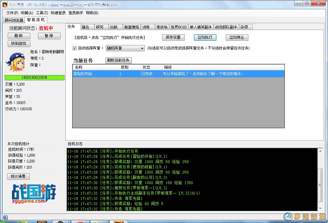 【輔助名稱】 冒險奇航顧問 【輔助使用說明】 http://www.i5wg.com/forum.php?mod=viewthread&tid=2973 【功能說明】 一、自動任務 二、自動強化 三、自動研究 四、自動出航 五、艙室建築 六、自動訓練 七、